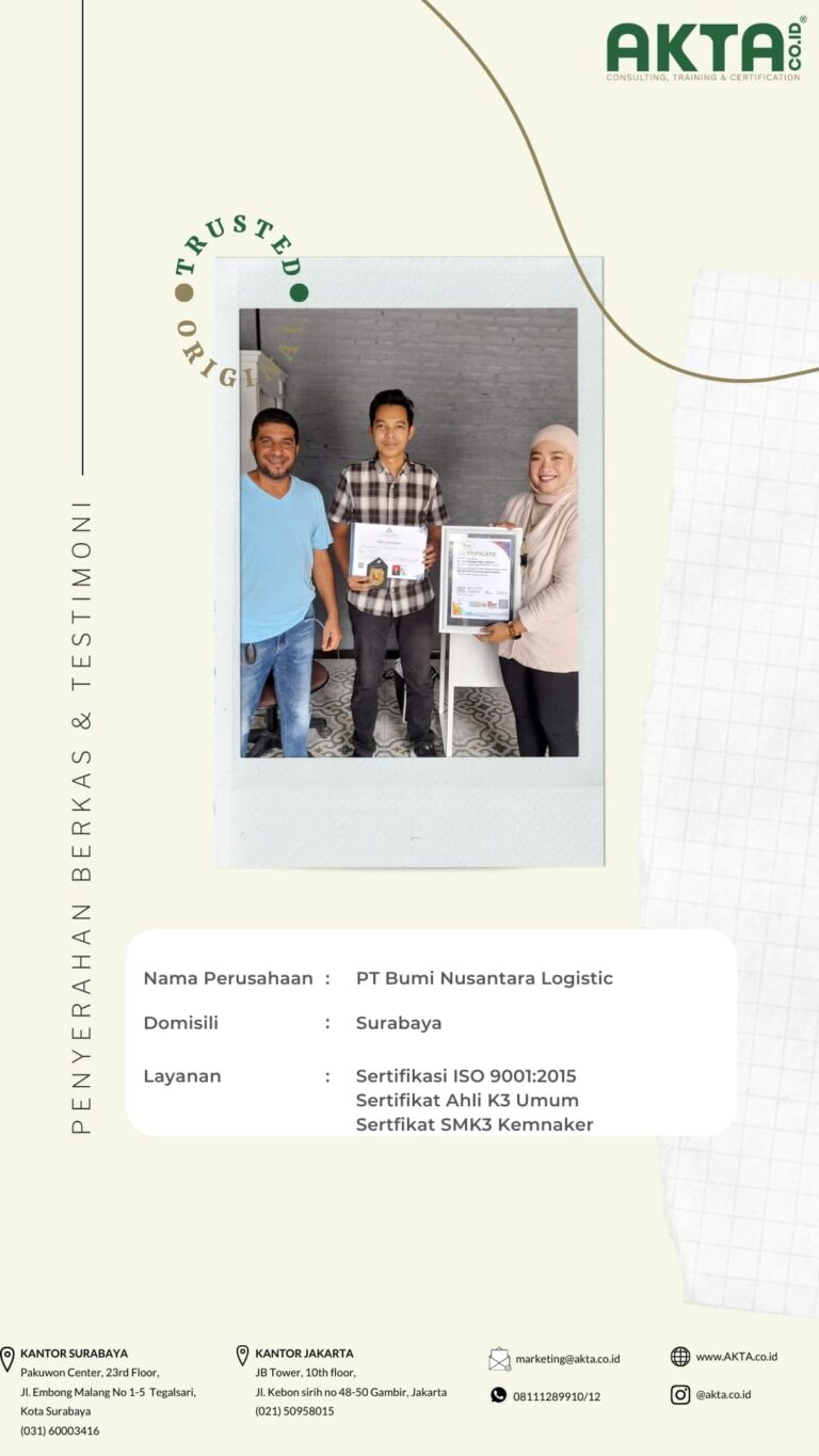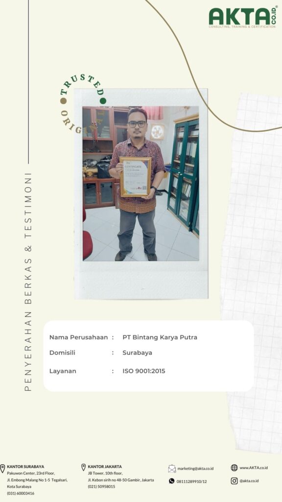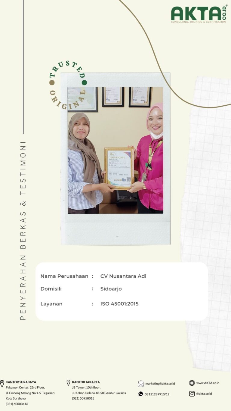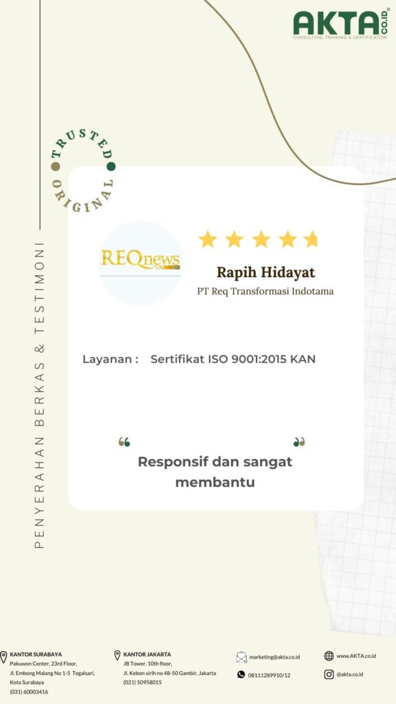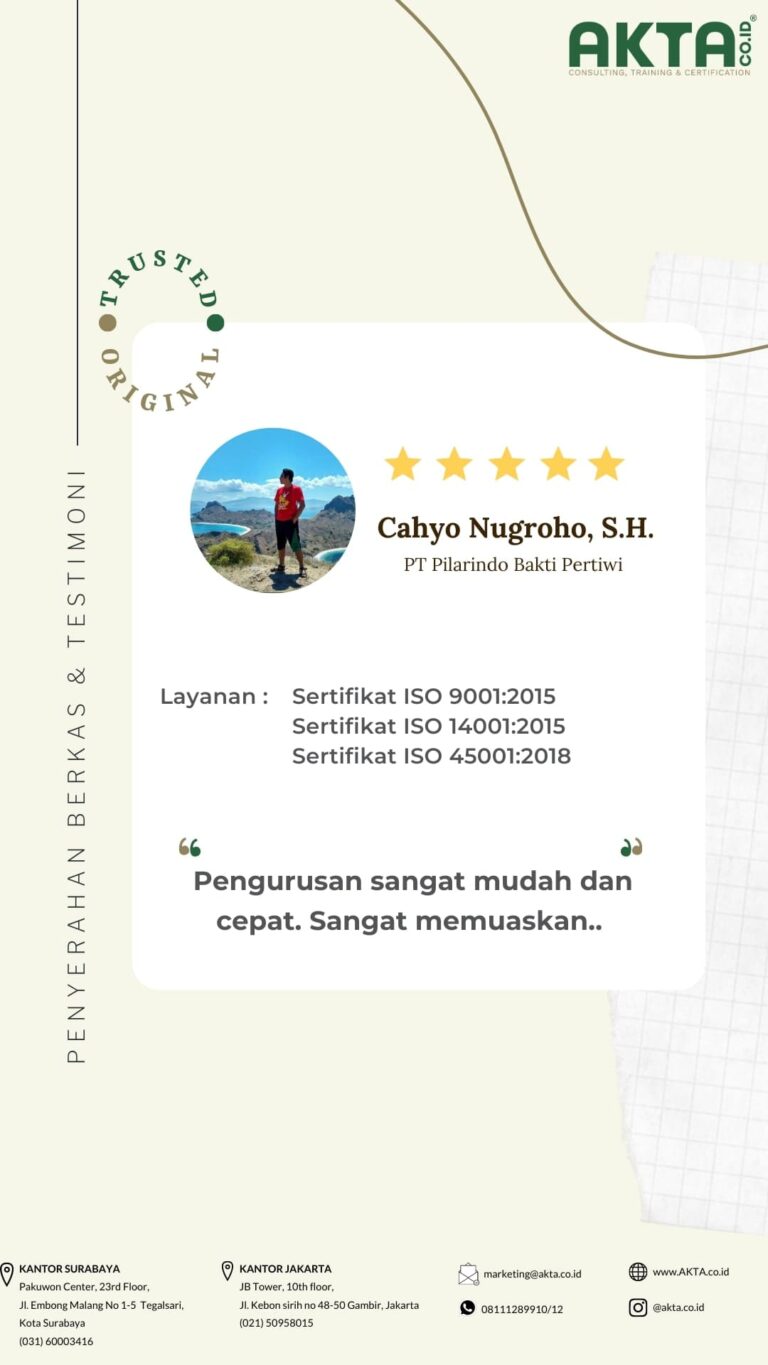 Mengurus sertifikat ISO di Akta Consulting, harganya terbaik dengan kualitas pelayanan yang TOP.